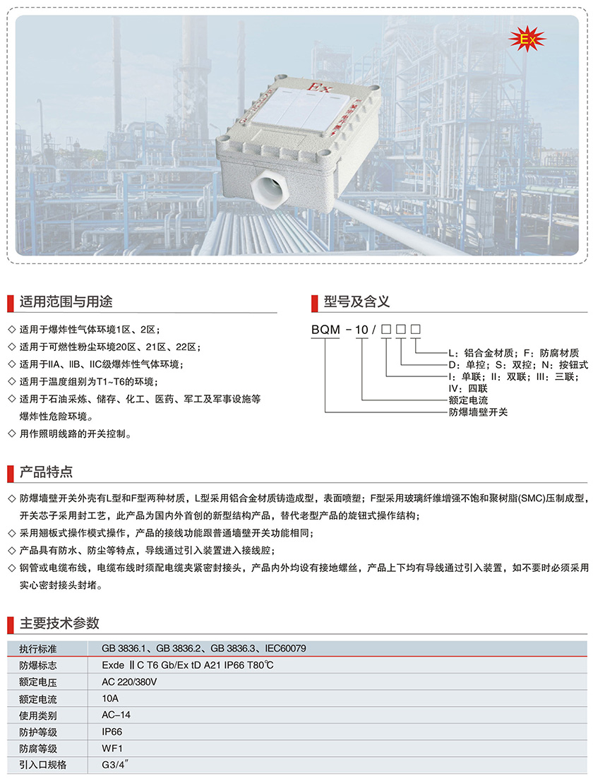 BQM-10系列防爆墙壁开关(IIC、Ex tD)